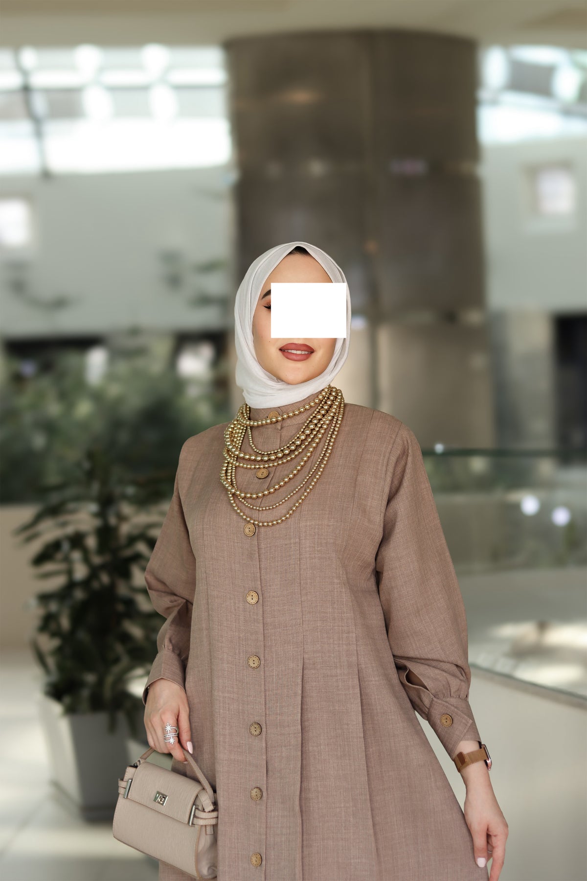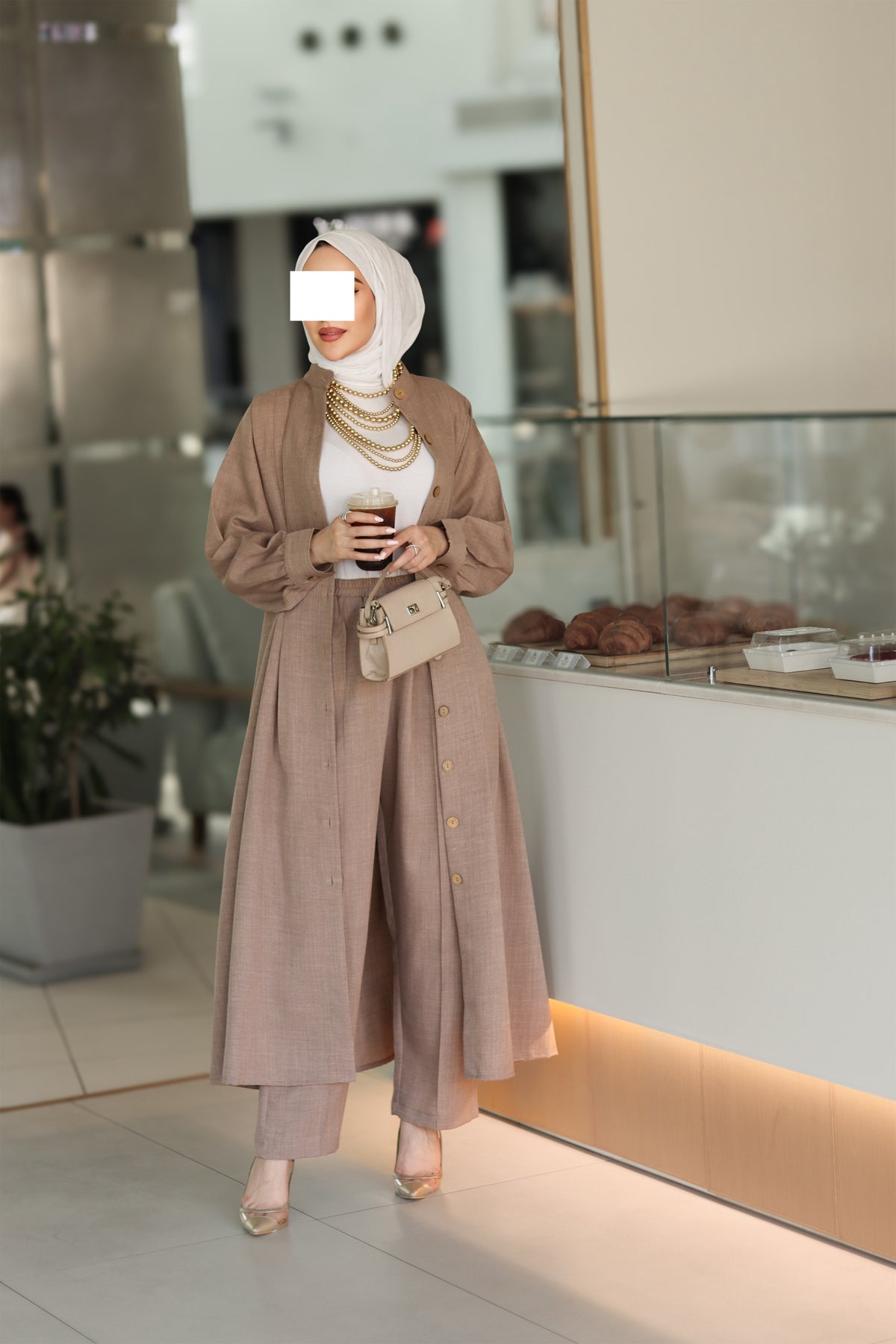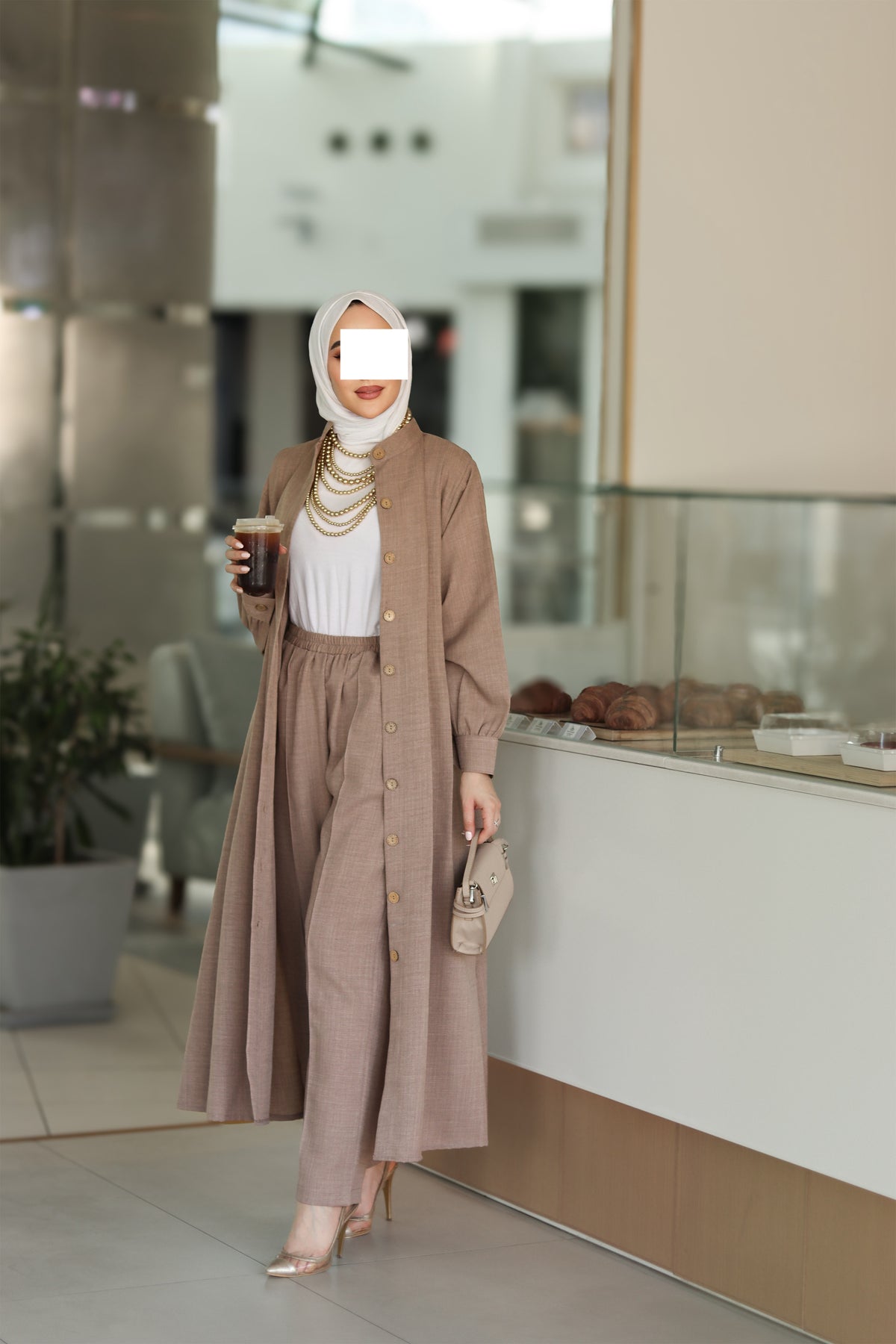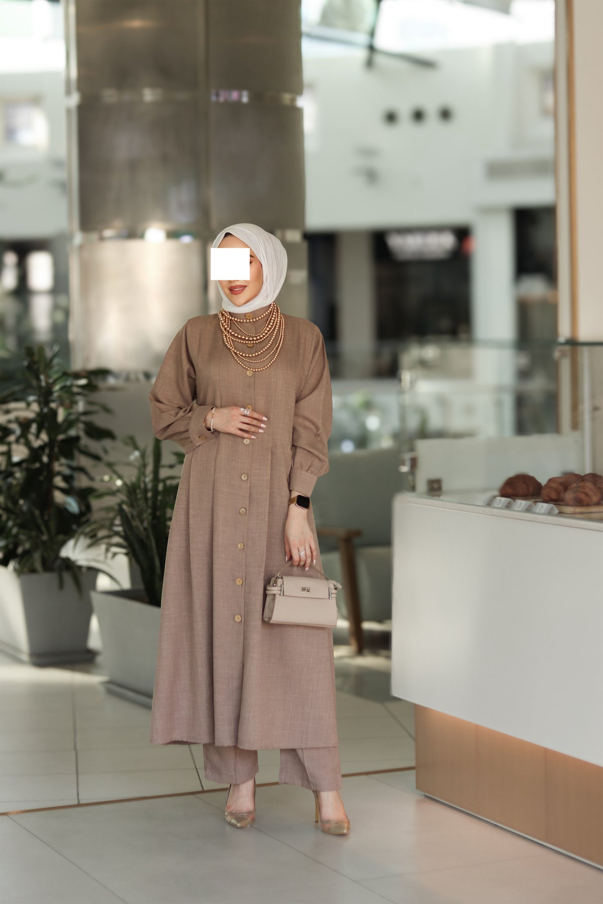 إطلالة أنيقة بكل سلاسة بلون الموكا الناعم—طقم موكا غريس الكتاني مصمم للمرأة العصرية التي تجمع بين الأناقة والراحة. البنطلون الواسع والتونيك الطويل بالأزرار مصنوعان من كتان خفيف ومريح، مثالي لأوقات الصباح في المقهى أو اللقاءات الأنيقة خلال الأسبوع. نسّقيه مع إكسسوارات ذهبية طبقية وكعب حيادي لإطلالة راقية لا تُنسى.
