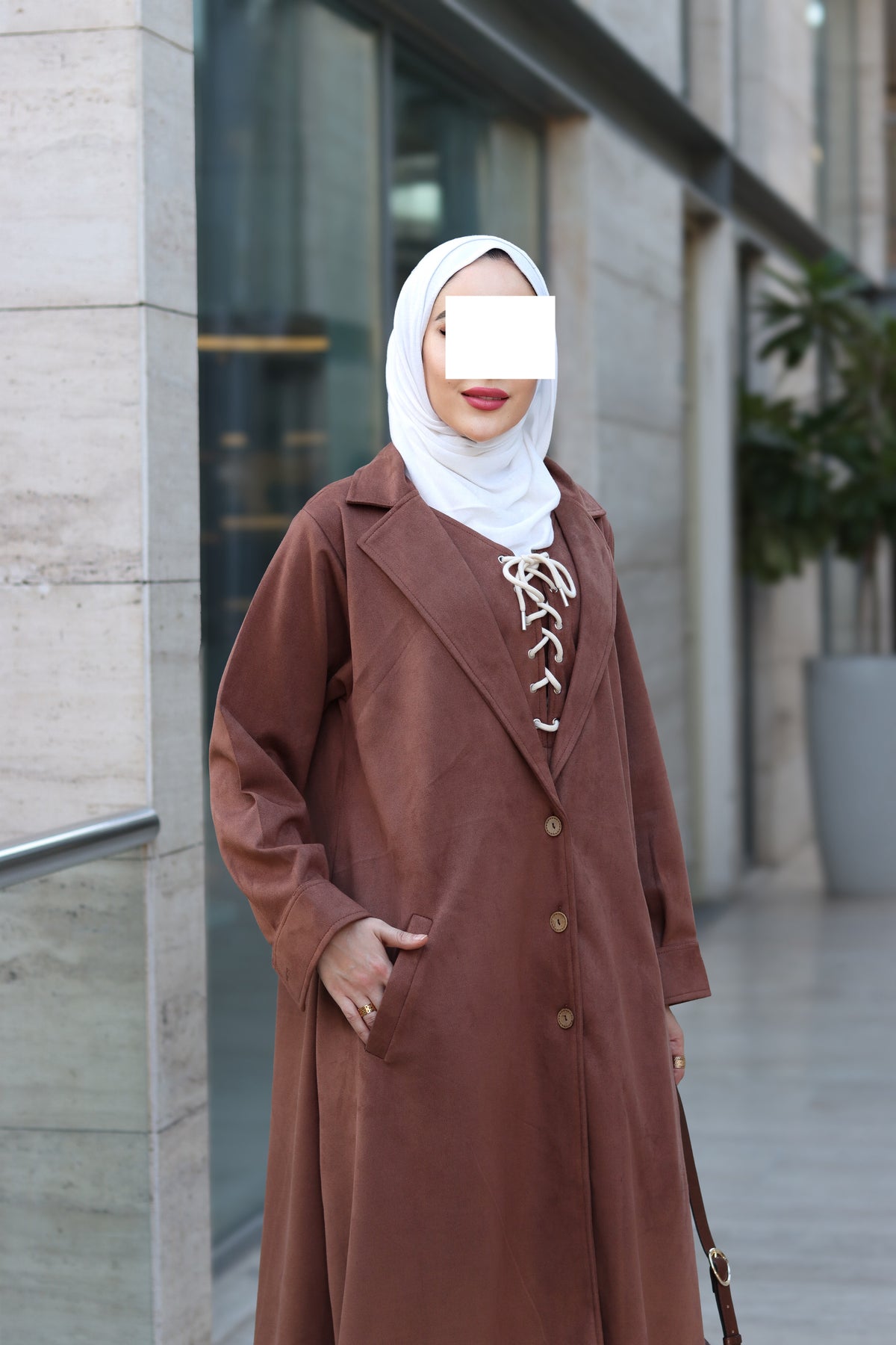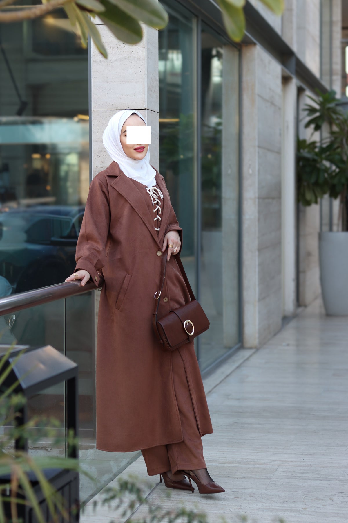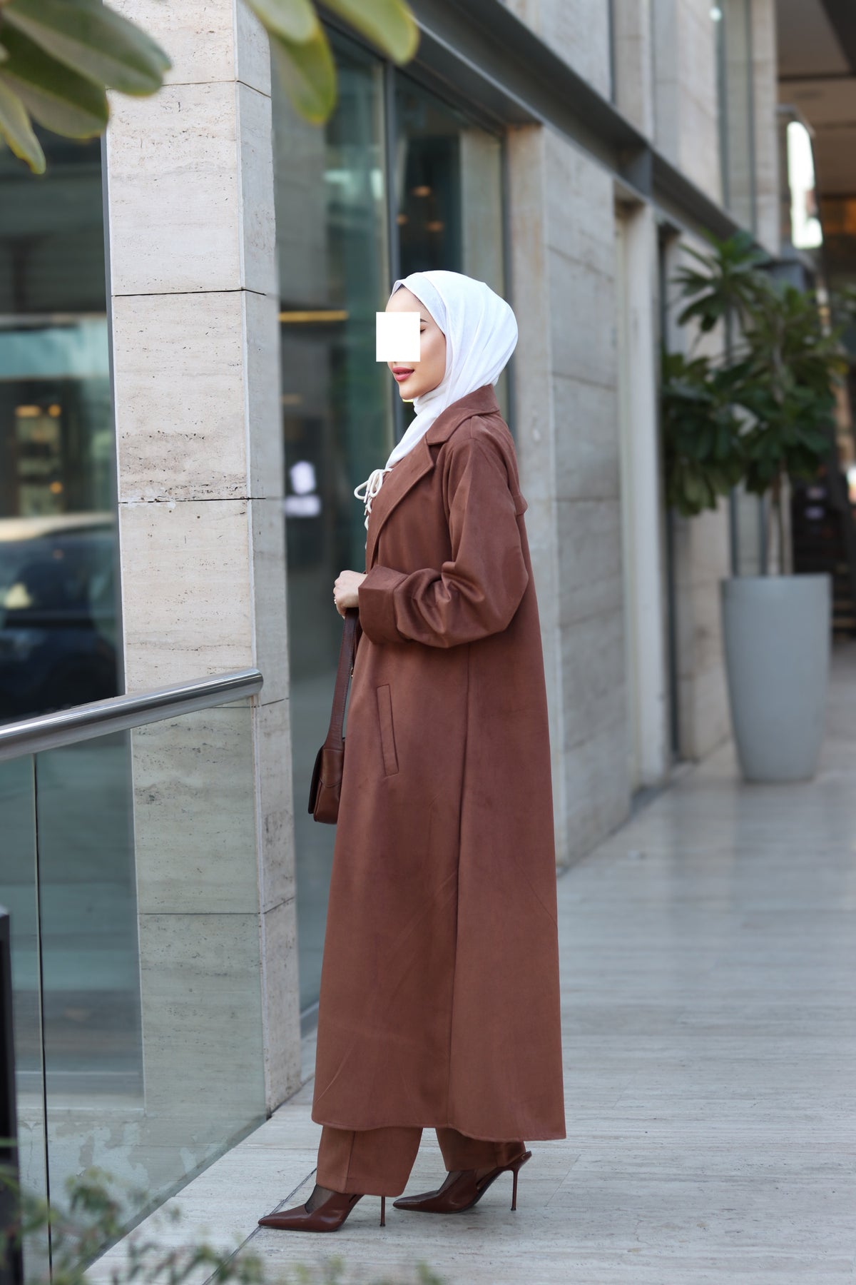 Elevated and effortlessly chic, this Long chamois Jacket with Pant set defines modern sophistication. Crafted from ultra-soft chamois fabric in a warm mocha hue, it features a flowing longline jacket layered over a lace-up top and straight-leg pants — creating a statement silhouette that blends ease with elegance. Perfect for transitional days or refined outings, it’s where classic tailoring meets contemporary charm.