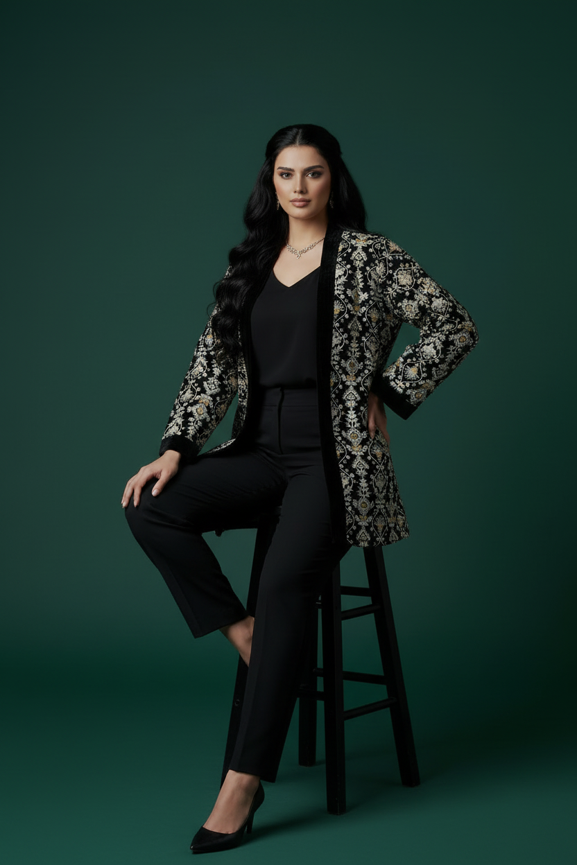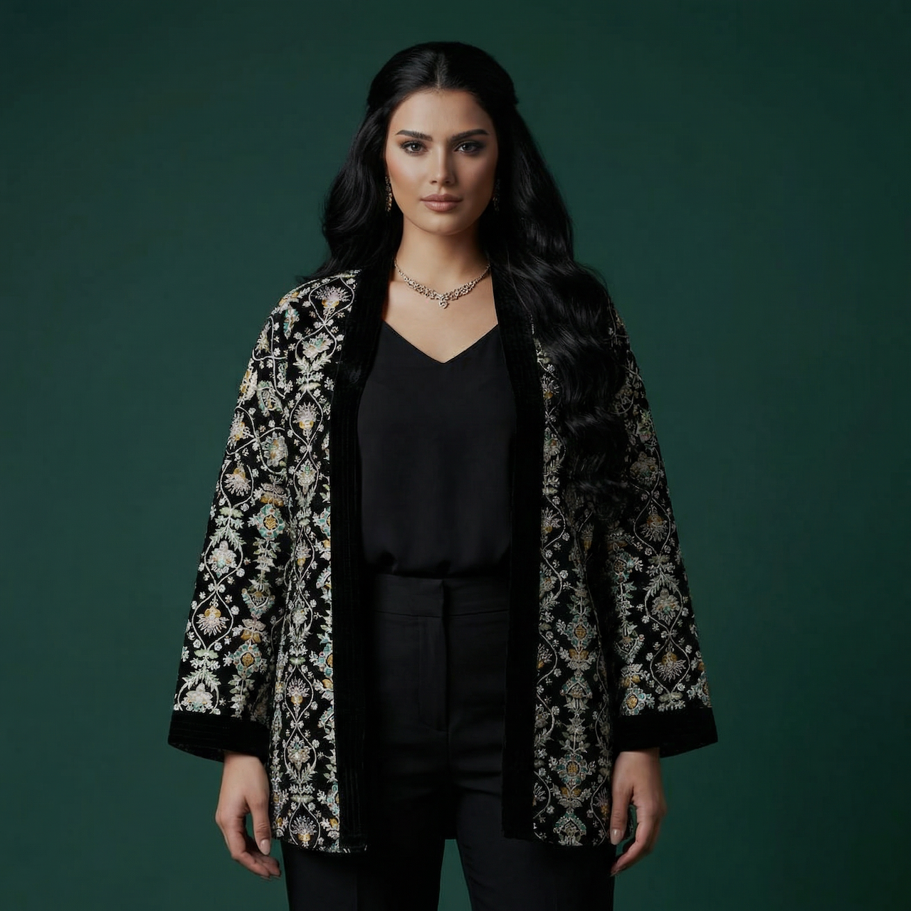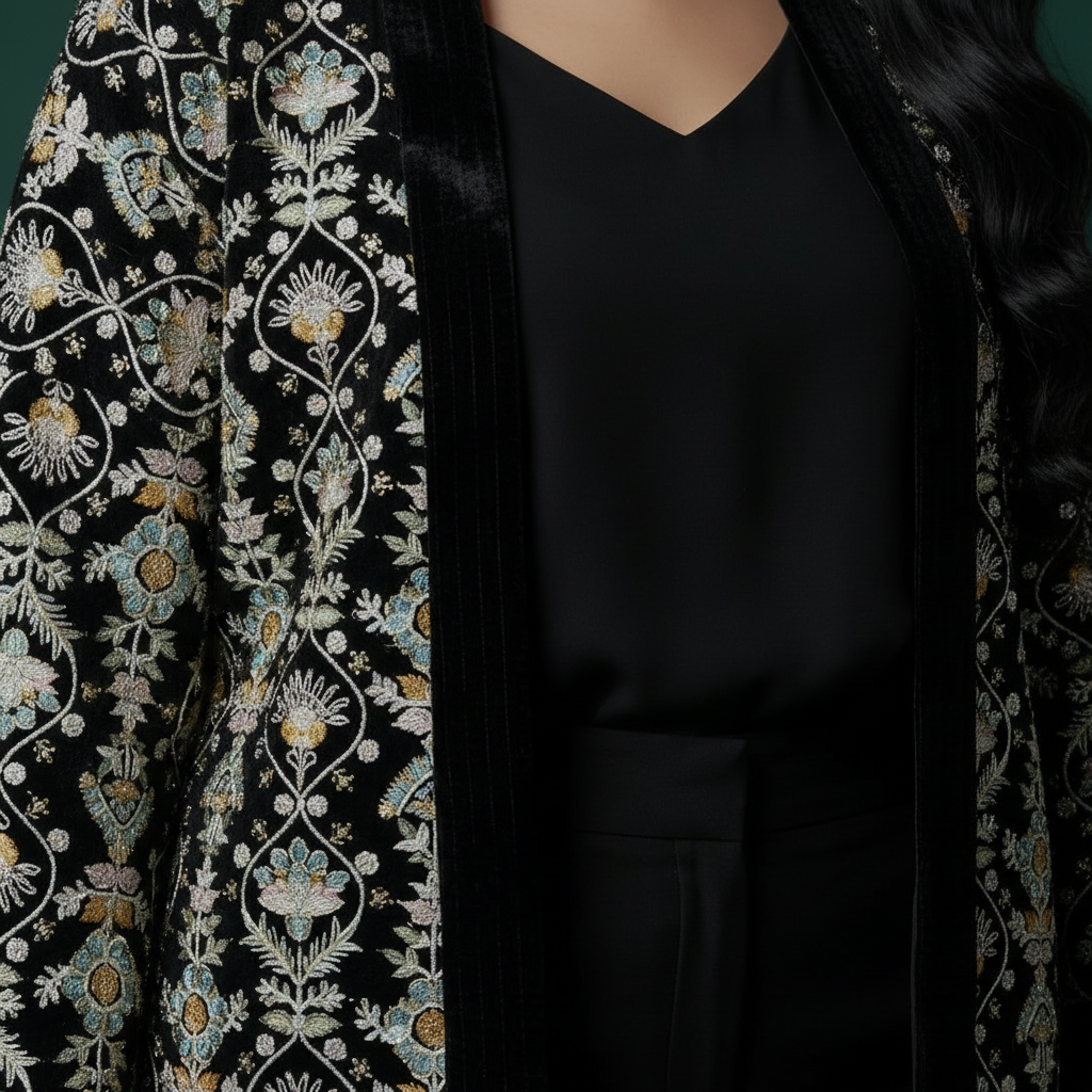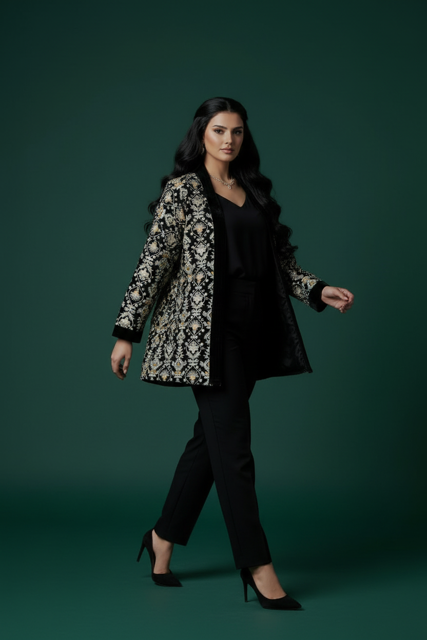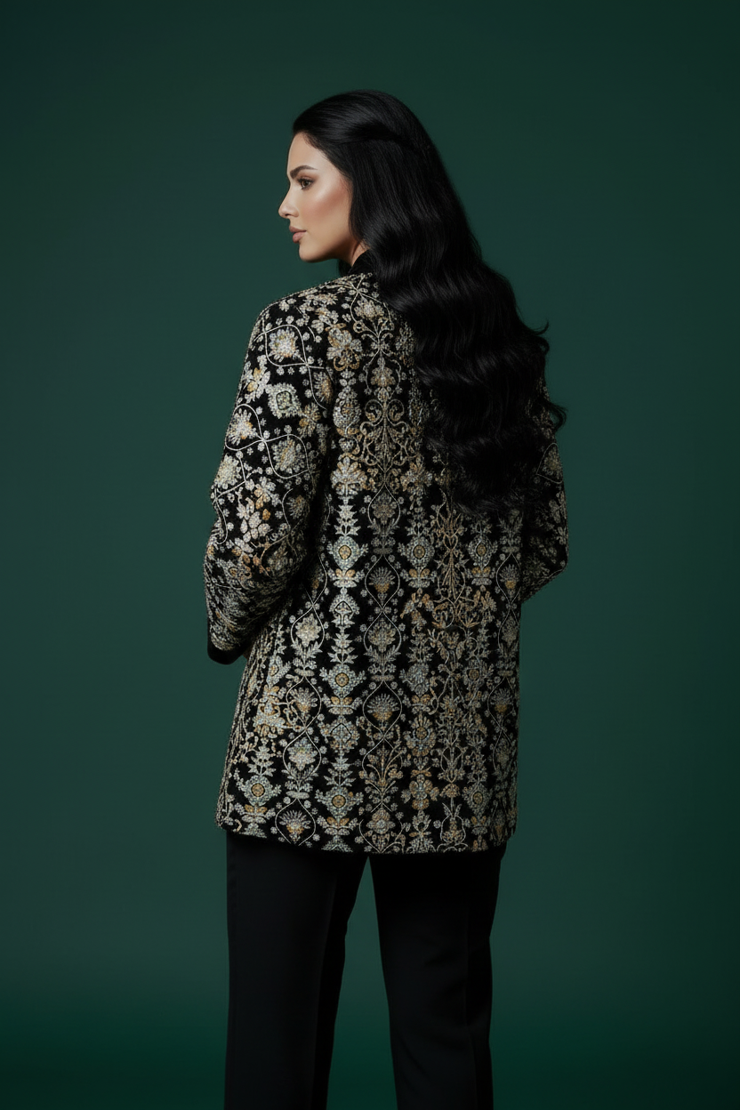 Embroidered jacket in luxurious black velvet featuring intricate gold paisley detailing.
