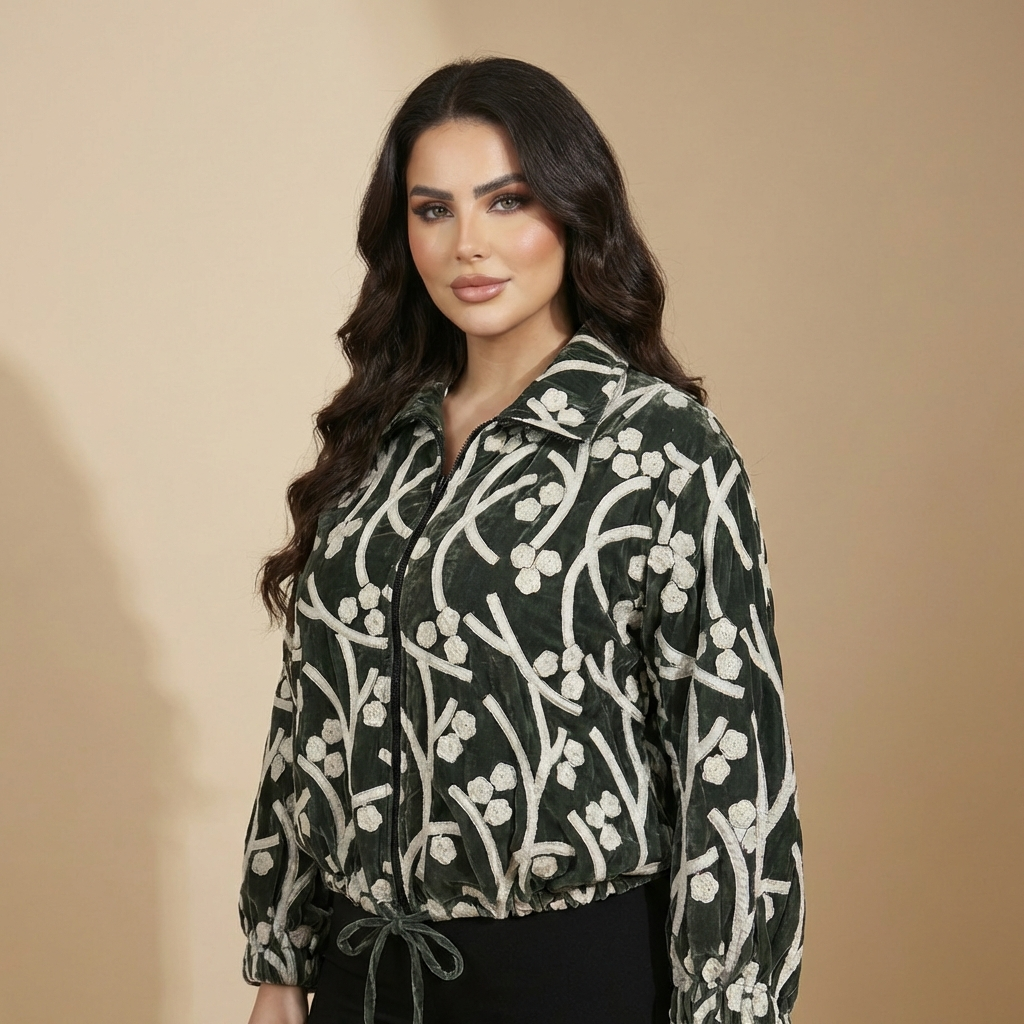 Luxurious emerald green velvet jacket adorned with elegant cream floral embroidery. This premium piece features an intricate botanical pattern with curved stems and delicate flower motifs throughout, creating a sophisticated and refined look.